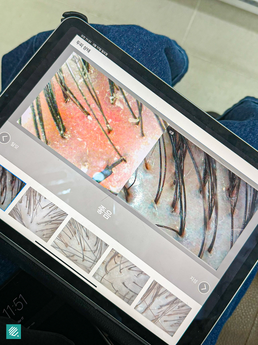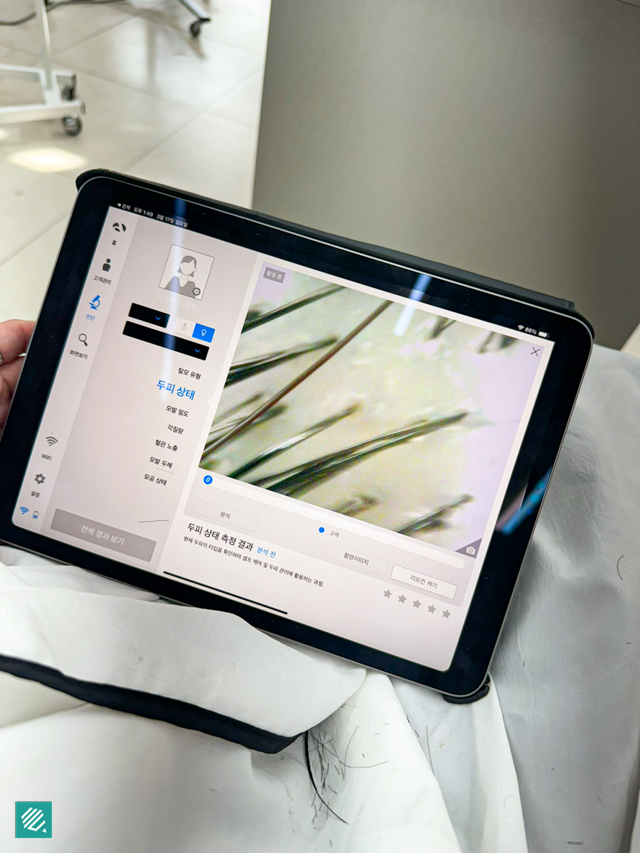 The session began with a scalp camera analysis. The camera showed a super zoomed-in look at the state of our scalp.