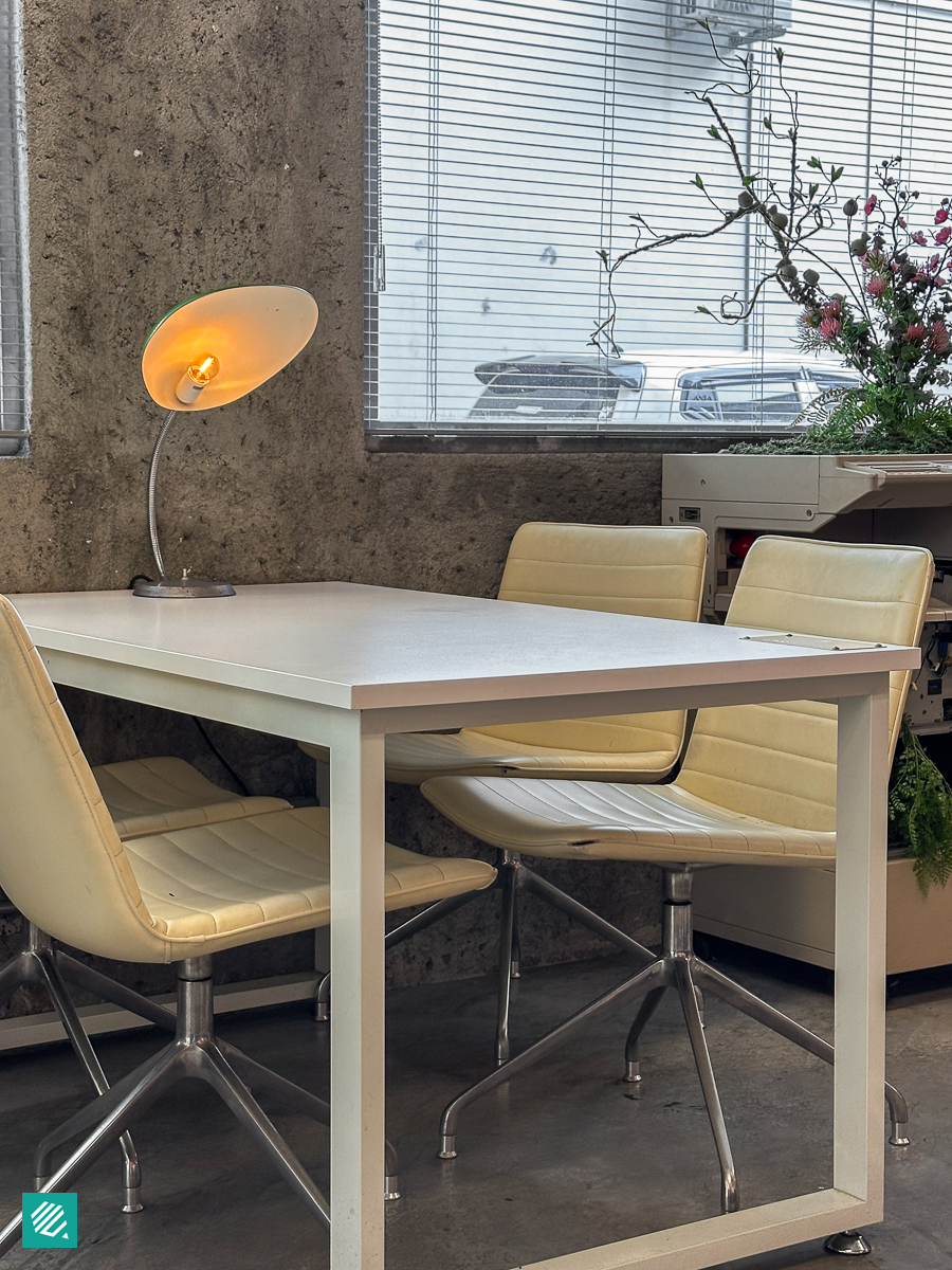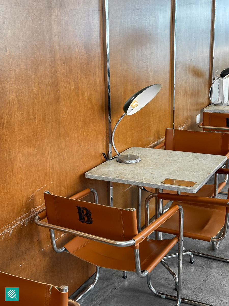 Inside, you’re greeted by a coffee counter, alongside an office-inspired interior. The space is decorated with brown and beige leather chairs, alongside modern tungsten lamps on each table. To further bring out the office theme, there are photocopier machines decorated with plants and flowers, which are very avant garde.