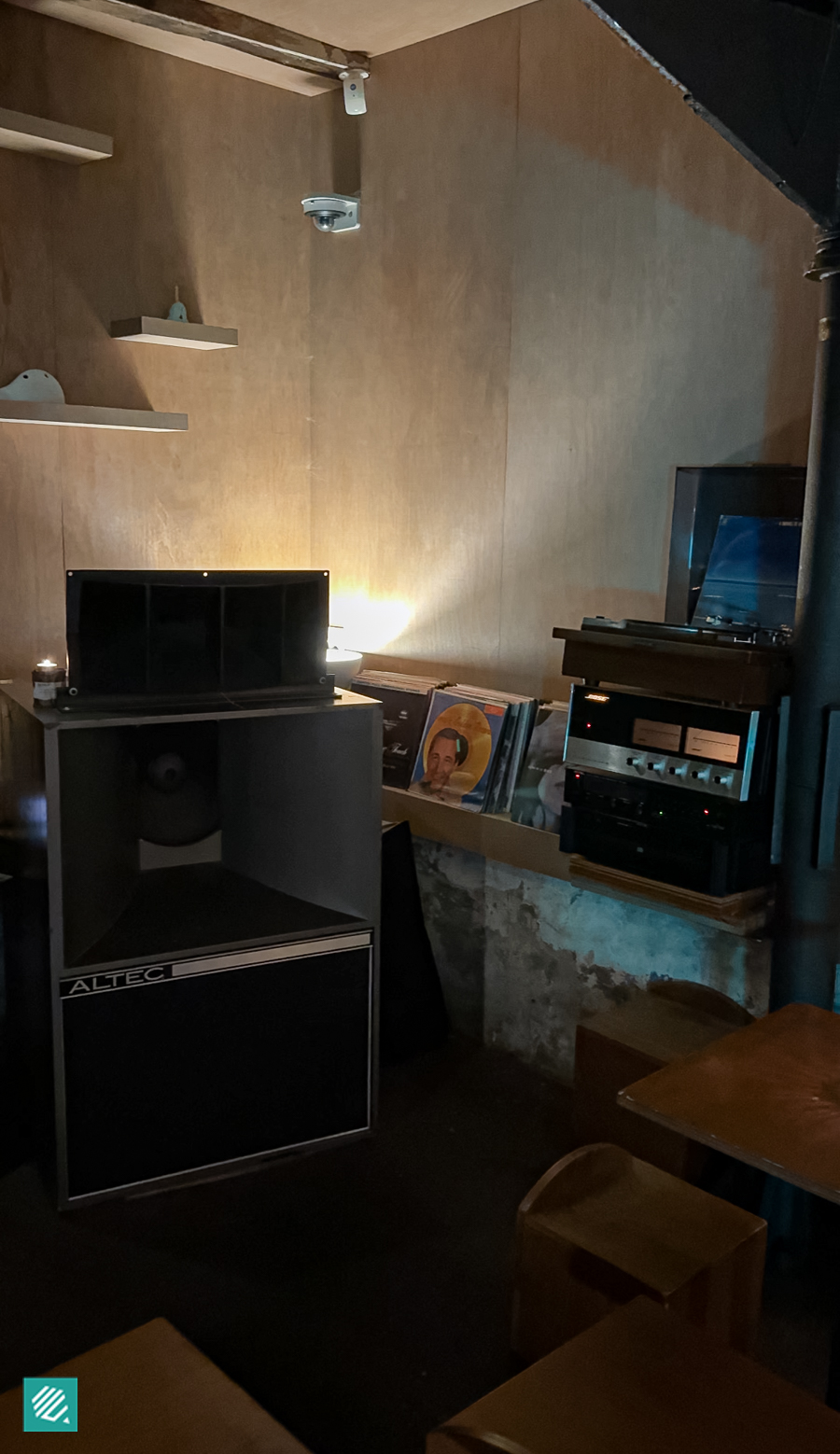 The space is a cafe by day and bar by night, giving a homey but chic vibe. It has fully wooden seating almost like a woodworking store, and a large music player blasting great music.