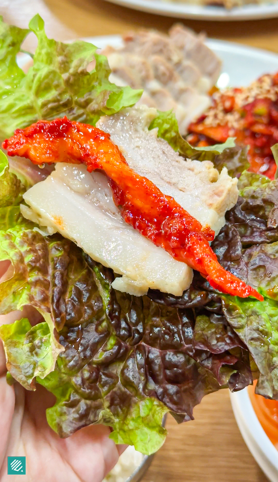 The classic way to enjoy bossam is with fresh lettuce and spicy radish kimchi a.k.a musaengchae (무생채).