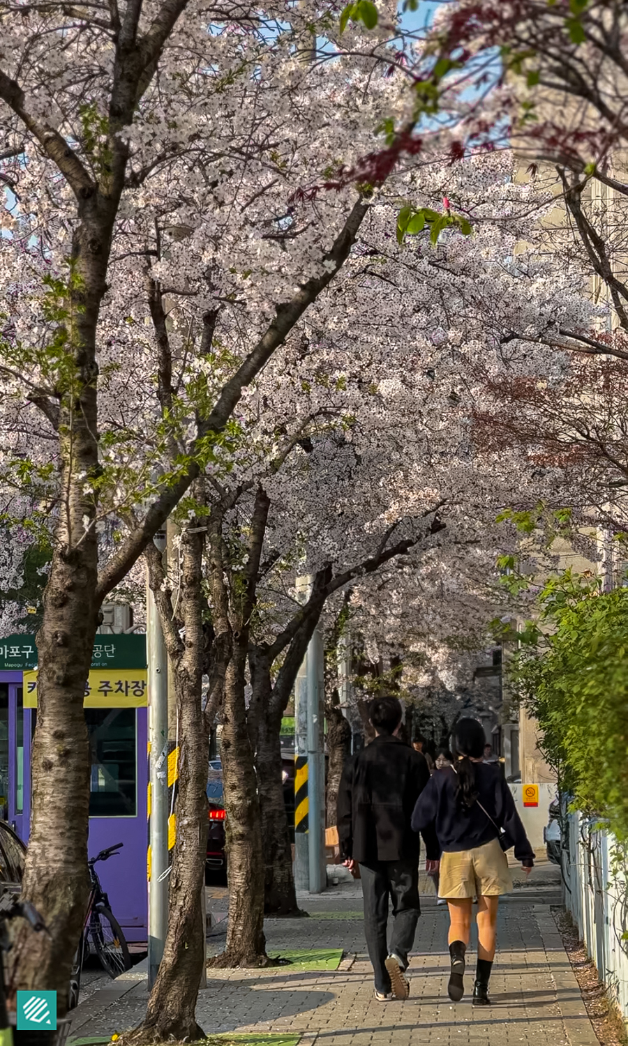 The quaint sight of the flowers and housing make this a popular cherry blossom spot in Busan.