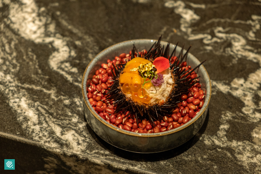 There was also fresh oyster topped with ikura, offering a burst of juiciness, and uni served in its sea urchin shell. This was complemented by hairy crab meat and sherry vinegar jelly, which paired well with the uni’s flavours.