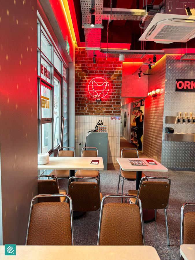 The restaurant has a unique retro diner-style aesthetic, with large windows, old-school seating and neon signs. There’s even a disco ball which adds to the vibes.