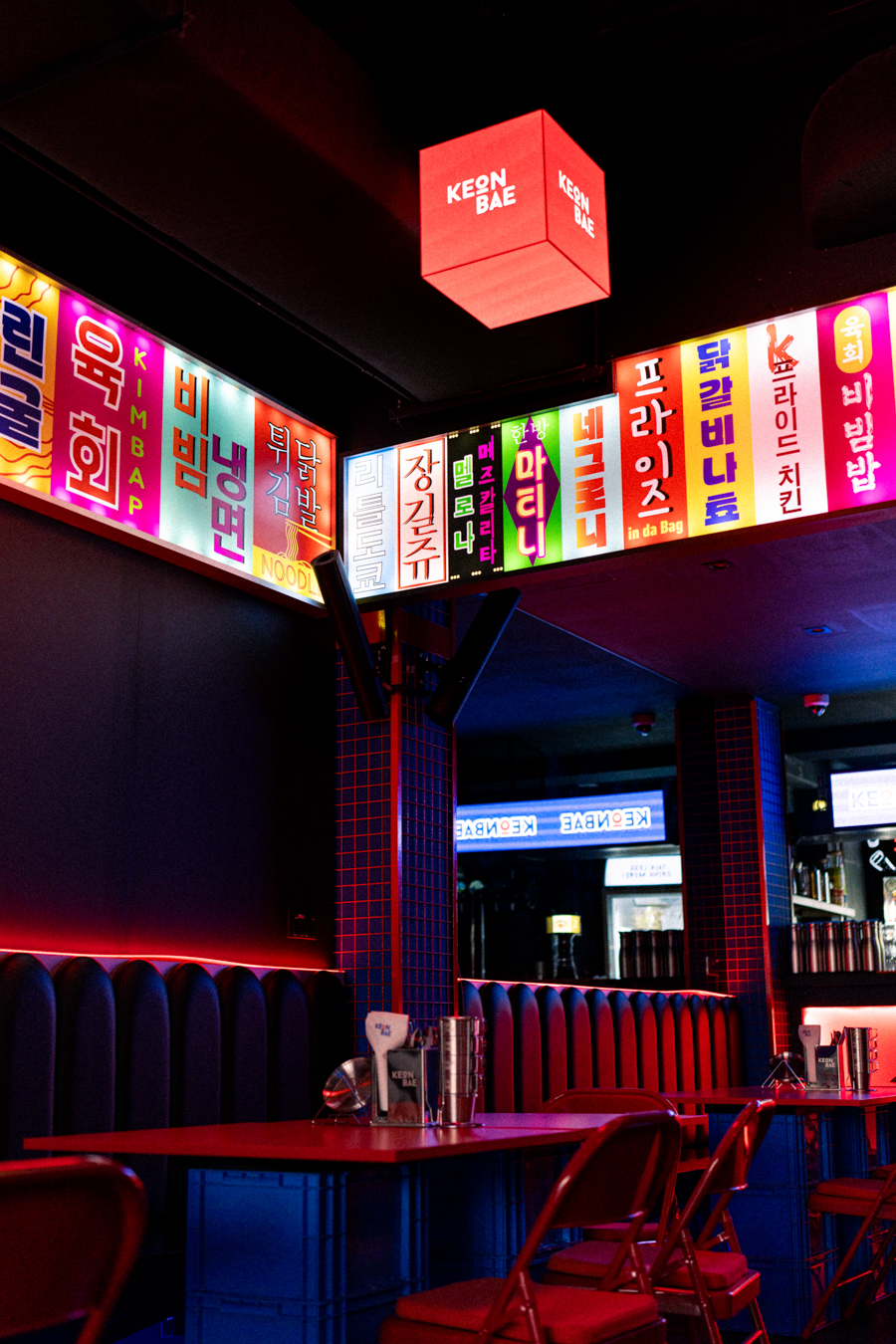 The interior is red and blue, reminiscent of the vibrant nightlife scene in Gangnam or Hongdae!