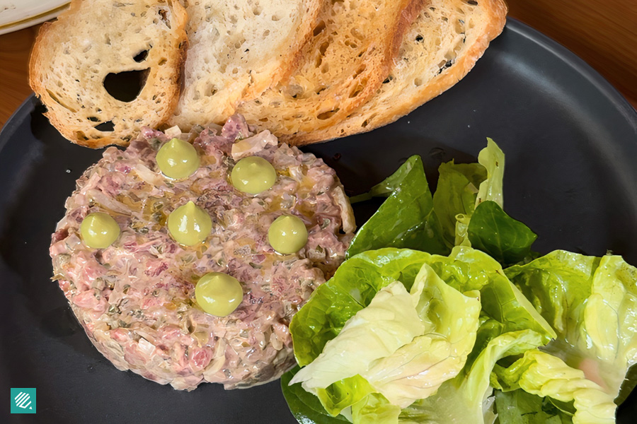 From the small plates menu, we tried the Steak Tartare ($22) skillfully hand-cut from O’Connor Beef tenderloin, giving a savoury taste. It came paired with a crispy Startler Lab baguette and a side of mixed greens, which I recommend combining in one bite for a truly enjoyable flavour experience!