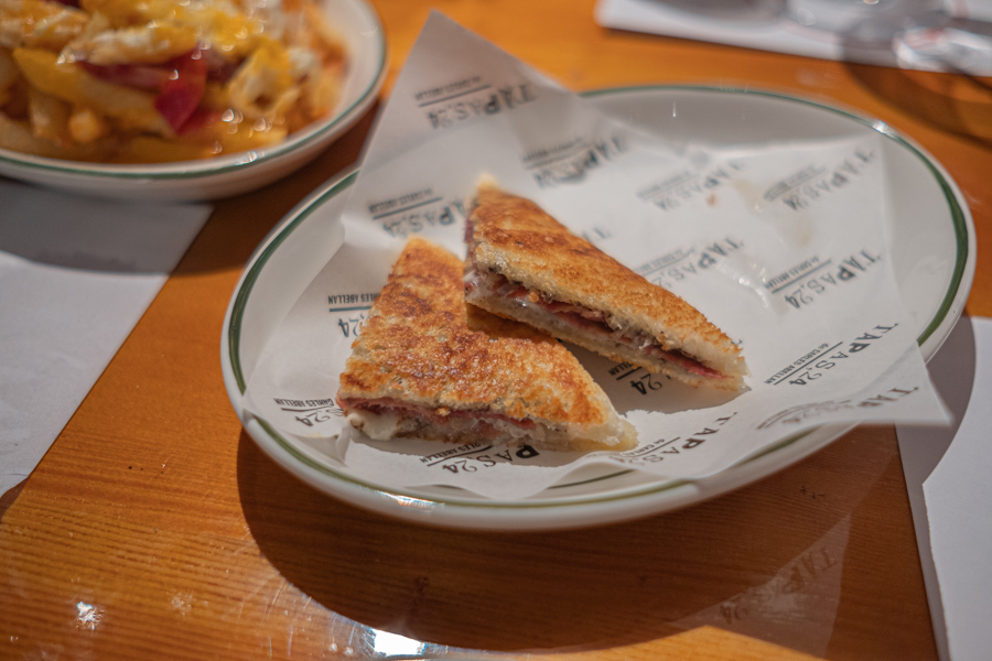 The red wine Bierzo “El Rebolon” 2018 is also by Bodegas Mengoba, and has a notably spicy finish with notes of cranberry and figs. Despite its darker red colour, it still has a pleasant lightness to its flavour, cutting through the salt of the “Tapas 24” Bikini Sandwich ($18) that features black truffle, iberico ham and buffalo mozzarella.