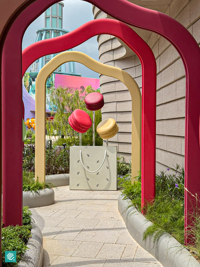 The outside is just as well-decorated, with a colourful walkway and gigantic macarons on the side of the building.