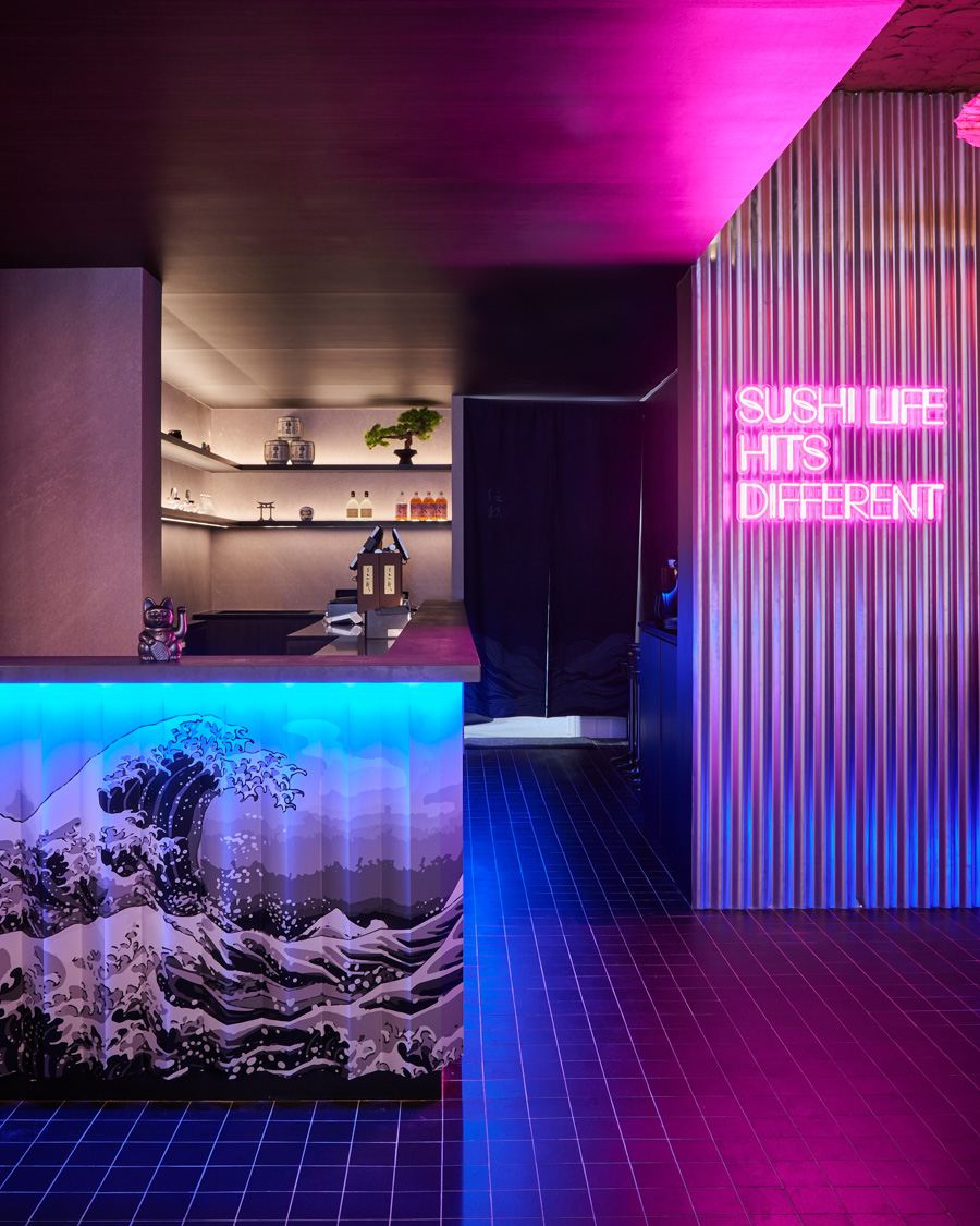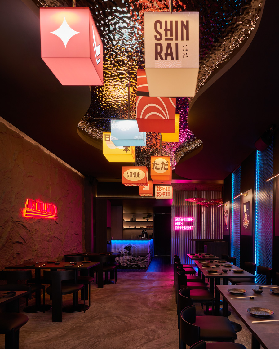 The interior of the restaurant combines modernity with a Japanese touch. There are neon lights that create a fun and inviting atmosphere, contrasted by the inclusion of a traditional Japanese umbrella (Wagasa).