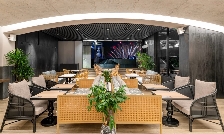 The bistro’s design features multiple open-concept spaces perfect for communal eating, including a lounge space and large dining room. The decor includes rattan furniture, bright lighting and a view of the Sentosa coastline.