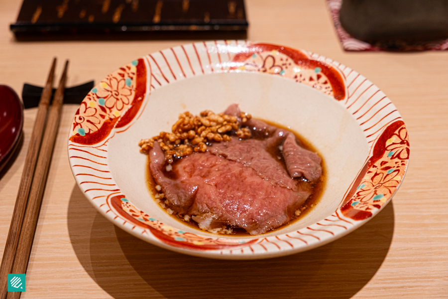 This trio of light bites included amberjack with pickled radish, lean tuna with chive on a beetroot cracker, and a wagyu beef croquette wrapped in cracker rice puff and fried seaweed.