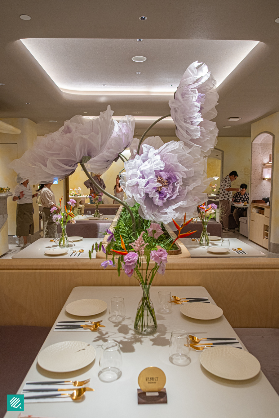 The restaurant space is decorated like a garden, full of flower imagery: from the fresh flower bouquets on every table to the oriental-inspired wall murals.