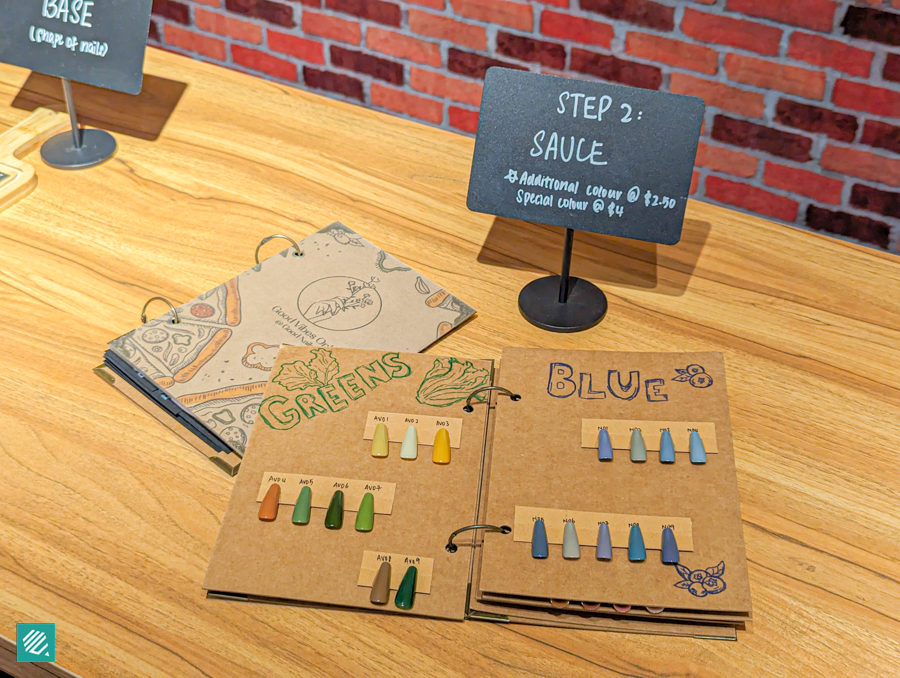 The owner, Grace, chose to break down the nail design process into different steps in which customers can have creative control over each element in their design. Just like building a pizza, there is a base and ‘toppings’, which are priced accordingly.